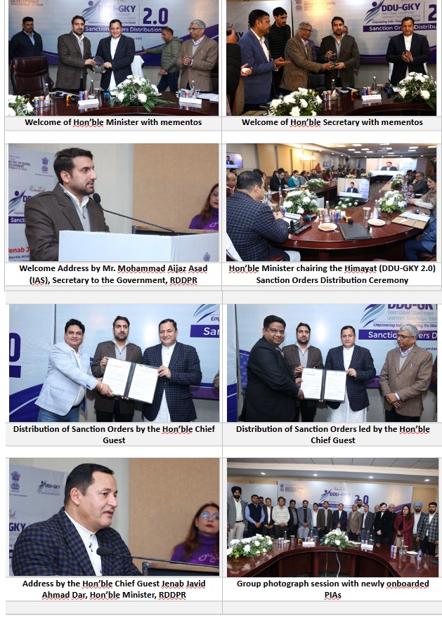 Himayat (DDU-GKY 2.0) Sanction Orders Distribution Ceremony was organised by the Himayat Mission Management Unit (HMMU), JKRLM on 26th December 2025 at Jammu, with the primary objective of formal onboarding of 13 selected Project Implementing Agencies (PIAs) for implementation of Himayat (DDU-GKY 2.0) during the programme year 2025–26 and to apprise them of the prescribed programme architecture, governance framework, compliance protocols, monitoring mechanisms, placement norms and reporting requirements. Sanction Orders were handed over to the selected PIAs and representatives by Jenab Javid Ahmad Dar, Hon’ble Minister for Rural Development & Panchayati Raj, Government of Jammu & Kashmir.