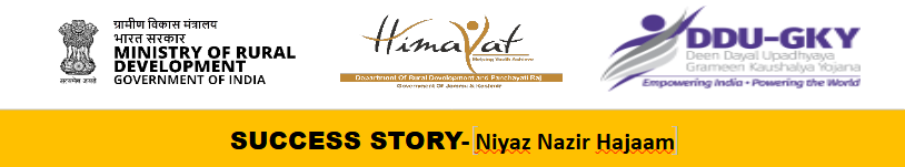 | Niyaz Ahmad Hajaam from Khargund, Chowgam, Kulgam, belongs to a lower-middle-class family of five, including his parents and three siblings. His father, a farmer, struggles to support the entire family. Needing a job to help, Niyaz learned about the DDU-GKY Himayat scheme from a friend. Motivated to improve his future, he enrolled in the Counter Sales Executive course to gain skills and support his family. |