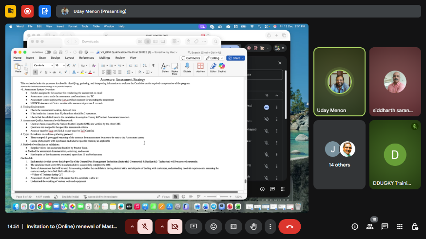 Under the Pest Management skilling initiative, two online programs for the renewal and onboarding of Master Trainers and Master Assessors for Pest Management Training on 11th & 12th Dec’25 respectively. These online programmes were organised by Dr. Sandhya Gopakumaran, Director Training & Development and Mr. Uday Menon, Industry Expert and Master Resource Person. The resource person for these two onboarding program/ workshop were Mr. GSS Prakash, Dr. K Malla Reddy, David Shalem.J, Mr. E Baskaran.