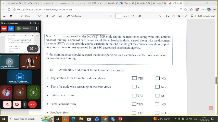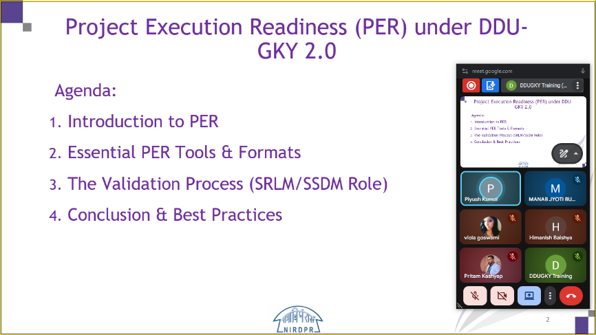 An online session training session with SRLM officials of Assam was organized on 19th Dec’25. The purpose of this session was to orient the officials on the PER and DD process in DDU-GKY2.0. The resource person for this online session was Mr. Piyush Kumar (Project Officer), Monitoring and Evaluation, DDU-GKY RC, NIRDPR.