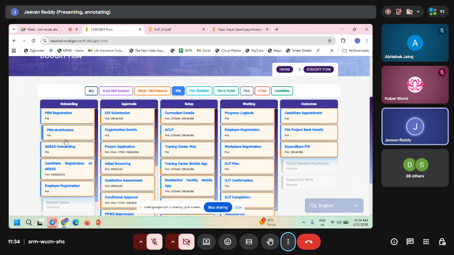 An online training session with PIAs and SRLM officials of Tripura was organized on 29th Jan’26. Through this session the officials were oriented on the PER & DD process in DDU-GKY2.0. The resource person for this online session was Shri. LA Santosh (Project Manager, DDUGKY RC, NIRDPR).