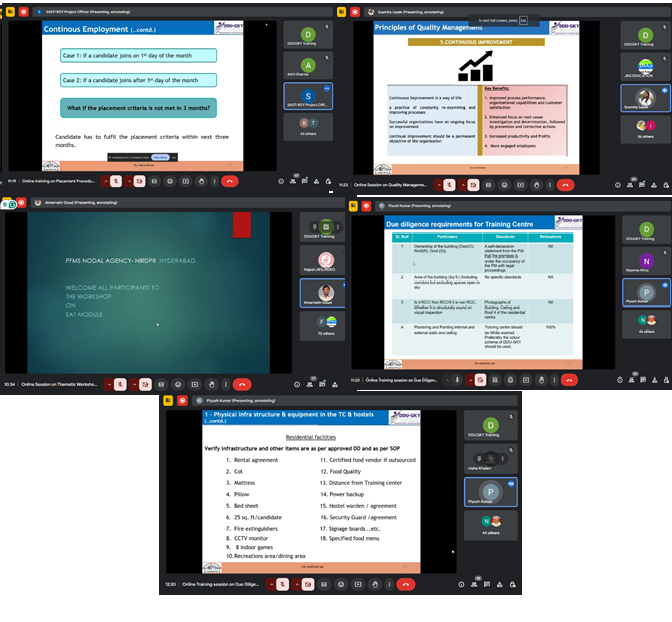 The Training & Development team conducted 4 programs in February ’25. All four training programmes were conducted online as per the training calendar. The topics that were covered in these online trainings were PFMS in DDU-GKY, Due diligence & Inspection, Placement Procedure and Quality Management. In these programs, 173 officials of SRLMs/ PIAs were up-skilled through these programmes..
