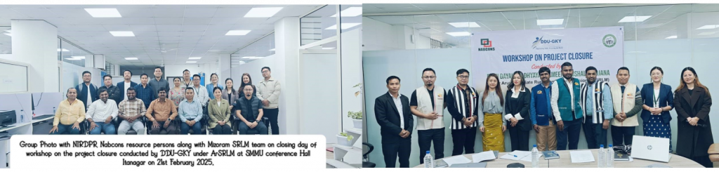 As CTSA as well as National Resource Organisation, DDU-GKY Resource Cell of NIRDPR has been providing hand-holding support to the SRLMs as per their demand. In the month, DDU-GKY team facilitated a 2-day workshop on Project Closure Procedure in DDU-GKY for SRLM, TSA, & NABCONS officials of Arunachal Pradesh and Mizoram SRLMs on 19th – 21st Feb’25 at Itanagar, Arunachal Pradesh. In this workshop, 25 officials were upskilled. In this workshop,Shri AR Amarnath, Shri Jagadeswar Reddy & Shri Naveen Bachu were deputed as Resource Persons to deliver the sessions.